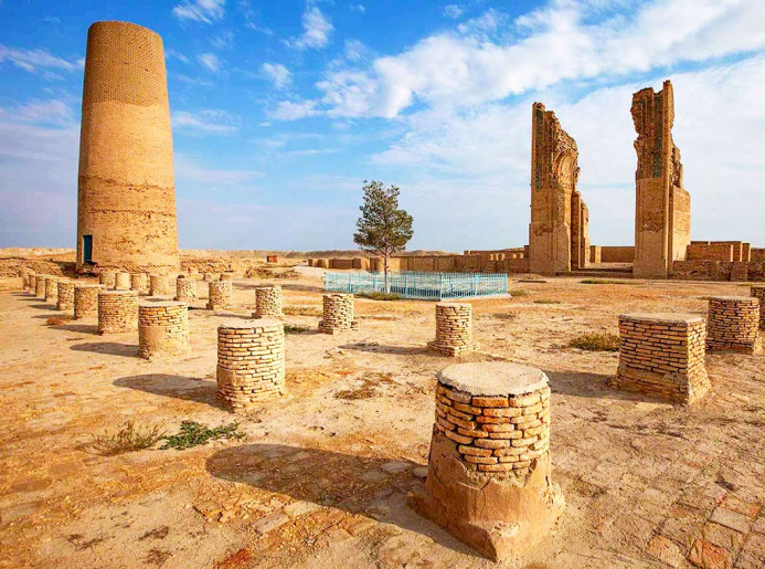 Among the preserved structures are the famous Shir-Kabir mausoleum, two minarets each 25 meters high, the portal of the main mosque, remnants of the mud-brick city walls, ruins of caravanserais, and mausoleums at the Mashad necropolis.